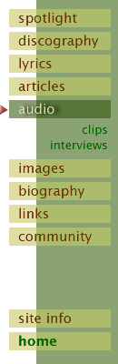 Audio Clips and Audio InterviewsThis area contains a slew of song samples to whet your appetite. (There are no complete songs here... can you say copyright infringement?) You'll also find several audio interviews here. Use the sublinks on the left to view the audio pages. How to listen to audio clips and interviewsAudio files are currently in RealAudio format (but will be converted to MP3 at some point). To listen to a RealAudio file, you'll need the RealPlayer or an appropriate plug-in for another player. Please let me know if you need help with the audio clips or encounter problems with them.